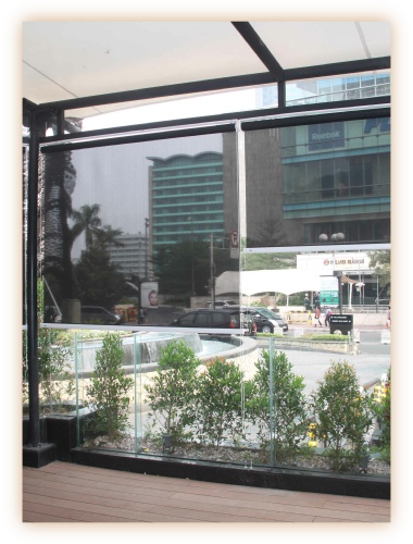 Monsoon blinds are made from special scratch-resistant PVC and acrylic fabrics. The former ensures a lasting ‘new-ness’ of your exterior blinds and the latter allow light to pass freely making it a perfect shield. The monsoon blinds not only safeguard against water but also heat and dust giving protection all-year around.The blinds are sealed panel-wise hence damage can be easily repaired by merely replacing a panel rather than replacing the whole blind.Available in Manual, Motorized and crank shaft systems.